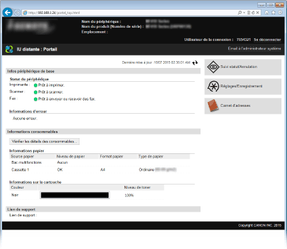 Vous pouvez effectuer toutes les opérations et paramètres de l'IU distante. Si un ID d'administrateur système est défini, saisissez-le dans [Code administrateur système], puis saisissez le code PIN dans [PIN administrateur système].
