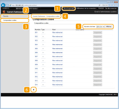 Affiche les numéros de composition codée et la liste des favoris mémorisés dans le carnet d'adresses. Vous pouvez également mémoriser/modifier le carnet d'adresses lorsque vous êtes connecté en tant qu'administrateur système.