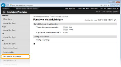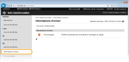 Cliquez sur [Numéro de tâche] pour les documents dont l'impression est suspendue et les documents sécurisés pour afficher leurs informations détaillées. Vous pouvez vérifier le nom de l'utilisateur et le nombre de pages sur le document imprimé.