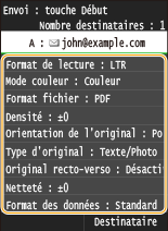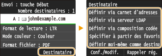 Si vous définissez plusieurs destinataires, le deuxième destinataire et les suivants doivent être enregistrés dans le carnet d'adresses ou sur le serveur LDAP. Vous ne pouvez définir en CC et en CCI que des destinataires enregistrés dans le carnet d'adresses. Pour utiliser le carnet d'adresses ou un serveur LDAP, vous devez préalablement exécuter la procédure d'enregistrement.