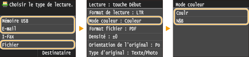 Sélectionnez <Mémoire USB> ou définissez un destinataire avec <E-mail>/<Fichier>