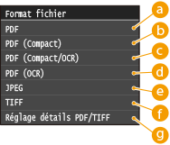 <PDF (Compact)> et <PDF (Compact/OCR)> compressent les photos et les illustrations des documents, plus que <PDF> et <PDF (OCR)>. Le fichier obtenu est plus léger, mais la qualité d'image de certains documents peut être moindre ou le nombre de documents pouvant être numérisés en une opération peut être inférieur.