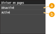 Si vous sélectionnez JPEG dans <Format fichier> et essayez de numériser un document depuis la vitre d'exposition, vous ne pouvez numériser qu'une page. Pour numériser un document de plusieurs pages tout en même temps, utilisez la cassette. Chaque page du document est sauvegardée comme fichier séparé. Si vous sélectionnez TIFF ou PDF, vous pouvez numériser des documents de plusieurs pages à partir de la vitre d'exposition ou de la cassette. Dans ce cas, vous pouvez utiliser Diviser un document page par page en plusieurs fichiers pour spécifier si la totalité du document numérisé doit être sauvegardé comme fichier unique ou si le document doit être sauvegardé sous la forme de fichiers multiples, page par page.