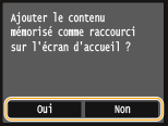 Si vous sélectionnez <Oui>, un message s'affiche. Consultez le message, puis appuyez sur <OK>. La combinaison de paramètres enregistrée s'ajoute à l'écran Accueil sous la forme d'un bouton de raccourci.