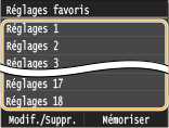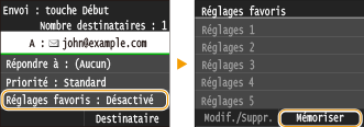 Pour modifier ou supprimer les paramètres enregistrés, accédez à <Lecture>  <E-mail>/<I-Fax>/<Fichier>  <Réglages favoris>  <Modif./Suppr.>  <Modifier> ou <Supprimer>, puis suivez les étapes ci-après.