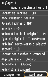 Consultez les détails des paramètres à enregistrer, puis appuyez sur <Appliquer>.