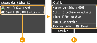 ![]() <Statut des tâches TX>Affiche une liste des documents en cours d'envoi ou en attente de traitement.