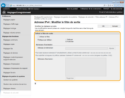 En cas de saisie incorrecte des adresses IP, vous risquez de ne pas pouvoir accéder à l'appareil depuis l'IU distante. Dans ce cas, vous devez définir <Filtre d'adresse IPv4> ou <Filtre d'adresse IPv6> sur <Désactivé>. Filtre d'adresse IPv4Filtre d'adresse IPv6