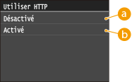 Le protocole HTTP permet d'établir une liaison réseau (lors de l'accès à l'appareil via l'interface utilisateur distante, par exemple). Si vous utilisez une connexion USB ou n'avez pas besoin d'établir une communication HTTP, vous pouvez désactiver le mode HTTP pour bloquer les intrusions de tierces parties via le port HTTP inutilisé.