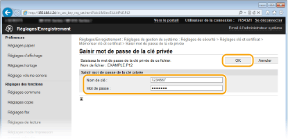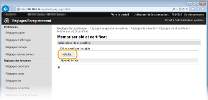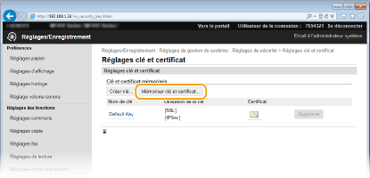 Cliquez sur [Réglages clé et certificat] pour installer une paire de clés, ou sur [Réglages certificat CA] pour installer un certificat CA.