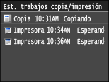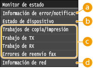 , aparecerá una pantalla en la que podrá comprobar el progreso de los documentos en proceso de impresión, enviados o recibidos, así como el estado del equipo (cantidad restante en el cartucho de tóner, etc.) e información sobre la configuración de la red, como puede ser la dirección IP del equipo.
