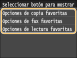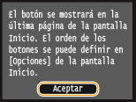 Podrá agregar botones de acceso directo a la pantalla Inicio para funciones utilizadas frecuentemente como pueden ser <Copia>, <Fax> y <Lectura>. Por ejemplo, podrá realizar tareas de un modo más rápido y eficiente asignando una secuencia de opciones (por ej., "Leer las dos caras de un documento, guardarlo como un archivo PDF con una compresión elevada y enviar a través de e-mail") a un mismo botón.