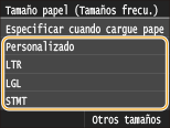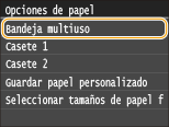 Una vez registradas las opciones de papel predeterminadas, la pantalla de configuración del papel no aparece cuando se carga papel, y se utiliza la misma configuración en todo momento. Si carga un tamaño o tipo de papel diferentes sin cambiar las opciones de papel, es posible que el equipo no imprima correctamente. Para evitar este problema, seleccione <Especificar cuando cargue papel> en el paso 3, y, a continuación, cargue el papel.