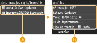 ![]() <Est. trabajos copia/impresión>Muestra una lista con los documentos que se están copiando, procesando o en espera de ser procesados.
