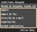 El nombre, los números de fax, las direcciones de e-mail, los nombres de organizaciones y la unidad de la organización son criterios disponibles para buscar destinos.