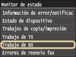Le permite imprimir informes de resultados de recepción cada vez que se almacenan documentos en la memoria. Para imprimir informes, pulse <On>. También deberá establecer <Informe resultado RX> en <On>.