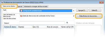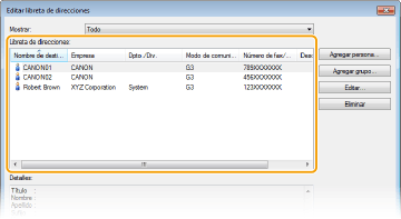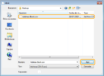 Los formatos de archivo que el controlador de fax puede leer son los tres siguientes: archivos CSV (*.csv), archivos Canon Address Book (*.abk) y archivos de información de configuración de dispositivo (*.dcm).