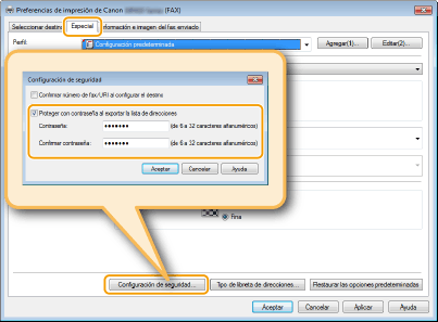 Si ha seleccionado [Proteger con contraseña al exportar la lista de direcciones] en el cuadro de diálogo que aparece al hacer clic en [Configuración de seguridad] en la pestaña [Especial], aparece un cuadro de diálogo para introducir una contraseña al hacer clic en [Exportar]. Para obtener más información, haga clic en [Ayuda] en la pantalla del controlador de fax.