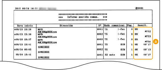 Cuando aparece un código de error). Para el e-mail, el Informe de gestión de comunicaciones indica el resultado de transmisión entre el equipo y el servidor de correo, no entre el equipo y la dirección de destino.