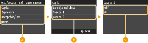 Seleccione <On> para habilitar la selección de casete de forma automática del origen del papel seleccionado en la pantalla anterior (