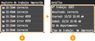 ![]() <Registro de trabajos impresión>Muestra una lista de los documentos que se han impreso.Correcto> aparece cuando un documento se imprime correctamente, y <Error> aparece cuando un documento no se imprime correctamente porque se canceló o se produjo algún error.