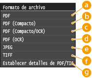 <PDF (Compacto)> y <PDF (Compacto/OCR)> comprime más las fotos y las ilustraciones en documentos que <PDF> y <PDF (OCR)>. El archivo será más pequeño, pero la calidad de la imagen de algunos documentos o el número de documentos que pueden leerse al mismo tiempo podría reducirse.