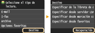 Puede seleccionar un destino entre los tres últimos destinos utilizados. Cuando se especifica un destino utilizado anteriormente, el equipo también configura las mismas opciones de lectura utilizadas la última vez que se enviaron documentos a dicho destino como, por ejemplo, la densidad.