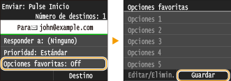 Para editar o eliminar opciones registradas, entre en <Lectura>  <E-mail>/<I-fax>/<Archivo>  <Opciones favoritas>  <Editar/Elimin.>  <Editar> o <Eliminar> y siga los pasos descritos a continuación.