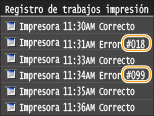 Si ocurre un error como, por ejemplo, si la impresión no se realiza correctamente o no puede enviar o recibir un fax o un documento leído, el código de error correspondiente aparecerá en un informe o en la pantalla <Registro de trabajos> en forma de número de tres dígitos. Consulte la siguiente información para averiguar las causas y las soluciones de cada código de error. Para obtener información sobre cómo imprimir un informe de errores e información en el informe, consulte