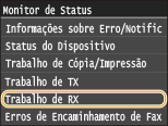 Permite que você imprima relatórios de Resultado RX sempre que os documentos forem armazenados na memória. Para imprimir relatórios, toque em <Ativado>. Você também precisa configurar <Relatório de Resultado RX> para <Ativado>.