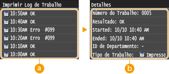![]() <Imprimir Log de Trabalho>Exibe uma lista de documentos que foram impressos. <OK> é exibido quando um documento foi impresso com sucesso, e <Erro> é exibido quando um documento falhou ao ser impresso pois foi cancelado ou ocorreu um erro.