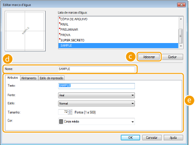 Clique em cada guia para especificar o texto, a cor, ou a posição de impressão da marca d'água. Para mais informações, clique em [Ajuda] na tela do driver de impressora.