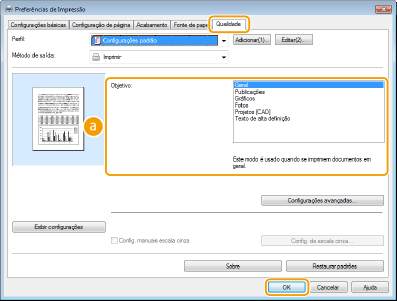 Para especificar configurações detalhadas para cada item selecionado em [Objetivo], clique em [Configurações avançadas]. Para mais informações, clique em [Ajuda] na tela do driver de impressora.