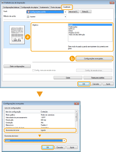 Na tela [Configurações avançadas], você pode especificar várias configurações de impressão diferentes das configurações de economia de toner. Para mais informações, clique em [Ajuda] na tela do driver de impressora.