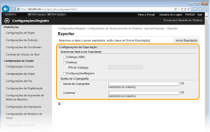 Digite uma senha de até 32 caracteres para criptografar os dados de exportação usando os caracteres alfanuméricos. Digite a mesma senha em [Confirmar]. Se a caixa de seleção [Catálogo] ou [Configurações/Registro] estiver marcada, os dados não podem ser exportados sem uma senha de criptografia definida.