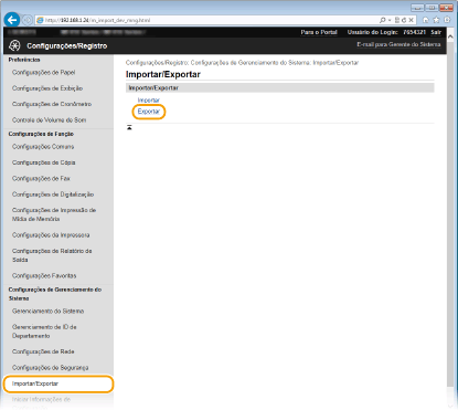 Você pode exportar dados da Agenda e da máquina e salvá-los em um computador. Você pode exportar dados do Catálogo de Endereço como um arquivo de informações de configuração do dispositivo (*.dcm) ou um arquivo do Catálogo de Endereço da Canon (*.abk). Selecione o tipo de arquivo de informações de configuração do dispositivo para salvar os dados como uma cópia de backup ou copiar os dados do Catálogo de Endereço para o mesmo modelo de máquina. Selecione o tipo de arquivo do Catálogo de Endereço da Canon para copiar os dados do Catálogo de Endereço para o driver de fax ou para um modelo de máquina diferente. É recomendável que você faça backup regularmente de configurações importantes.