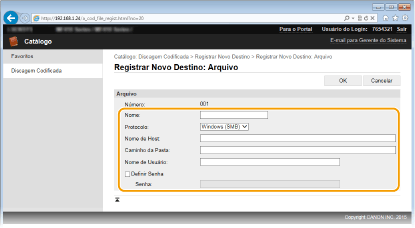 Você pode usar o computador para registrar destinos no catálogo de endereço da máquina e editar as informações de destino registradas. Especifique o destino da pasta compartilhada ou servidor de FTP aqui.