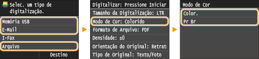 Selecione <Memória USB> ou especifique um destino com <E-Mail>/<Arquivo>