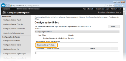 Usando o painel de operaçõesTambém é possível ativar ou desativar a comunicação IPSec no <Menu> da tela Início. Usar IPSec