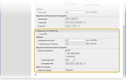 Para ativar a autenticação ESP, selecione [SHA1] para o algoritmo hash. Selecione [Não Usar] se você deseja desativar a autenticação ESP.