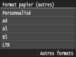 Si l'écran illustré ci-dessus ne s'affiche pas lorsque le papier est chargéSi vous chargez toujours le même papier dans le bac multifonctions, vous pouvez ignorer les opérations de configuration du papier en définissant par défaut le format et le type de papier. Notez que si un paramètre par défaut est enregistré, l'écran illustré ci-dessus ne s'affiche pas. Pour afficher l'écran, sélectionnez <Spécifier lors du chargement du papier> (Enregistrement des paramètres papier par défaut du bac multifonctions).