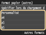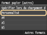 Une fois les paramètres papier par défaut enregistrés, l'écran de définition du papier ne s'affiche plus lorsque vous insérez du papier, et les mêmes paramètres sont appliqués systématiquement. Si vous chargez un papier de format ou de type différents sans modifier les paramètres papier, l'appareil risque de ne pas imprimer correctement. Pour éviter ce problème, sélectionnez <Spécifier lors du chargement du papier> à l'étape 3, puis chargez le papier.