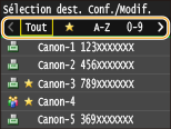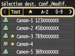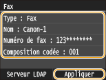 <Réglages fax>. Toutefois, les réglages effectués depuis <Carnet adress.> sont activés pour les paramètres détaillés des destinataires enregistrés dans le carnet d'adresses. |