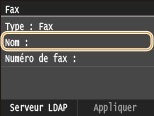 Le nom d'utilisateur, le numéro de fax ou l'adresse e-mail de l'utilisateur sélectionné, stocké sur le serveur LDAP, est copié dans le champ du destinataire.