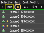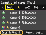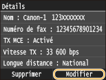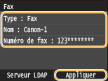 <Réglages fax>. Toutefois, les réglages effectués depuis <Carnet adress.> sont activés pour les paramètres détaillés des destinataires enregistrés dans le carnet d'adresses. |