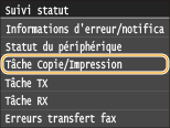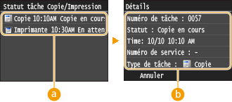 ![]() <Statut tâche Copie/Impression>Affiche une liste des documents en cours de copie, de traitement ou en attente de traitement.