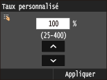 Appuyez sur / ou les touches du pavé numérique pour saisir le taux de reproduction et appuyez sur <Appliquer>. Vous pouvez définir n'importe quel taux compris entre 25 % et 400 % par incréments de 1 %.