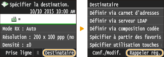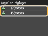 Vous pouvez sélectionner un destinataire parmi les trois derniers destinataires. Lorsque vous désignez un destinataire que vous avez déjà utilisé, l'appareil réutilise les mêmes réglages de télécopie que ceux qu'il a utilisés lors de l'envoi des documents au destinataire en question.
