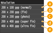 Vous pouvez sélectionner la résolution qui convient au type de document actuel. Plus la résolution est élevée, plus l'image est nette, mais plus la durée de la transmission sera longue.