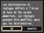 Pour modifier ou supprimer les paramètres enregistrés, accédez à <Fax>  <Réglages favoris>  <Modif./Suppr.>  <Modifier> ou <Supprimer>, puis suivez les étapes ci-après.